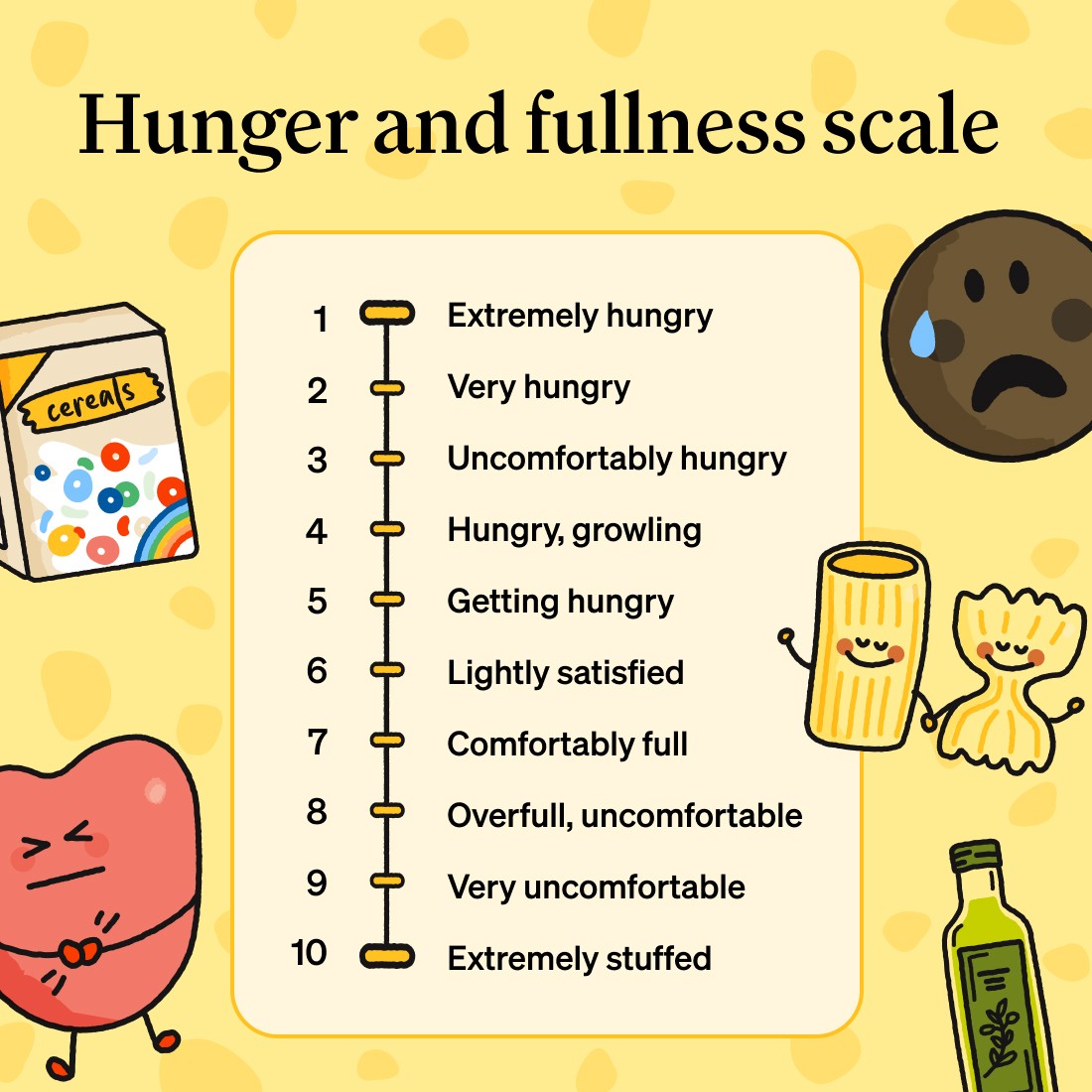 This scale can be used before eating, during a meal or snack, and after eating to evaluate your hunger level and determine whether you’d like to begin eating, continue, or stop eating. Over time, it can help build awareness, strengthen body trust, and support more balanced, satisfying eating experiences.