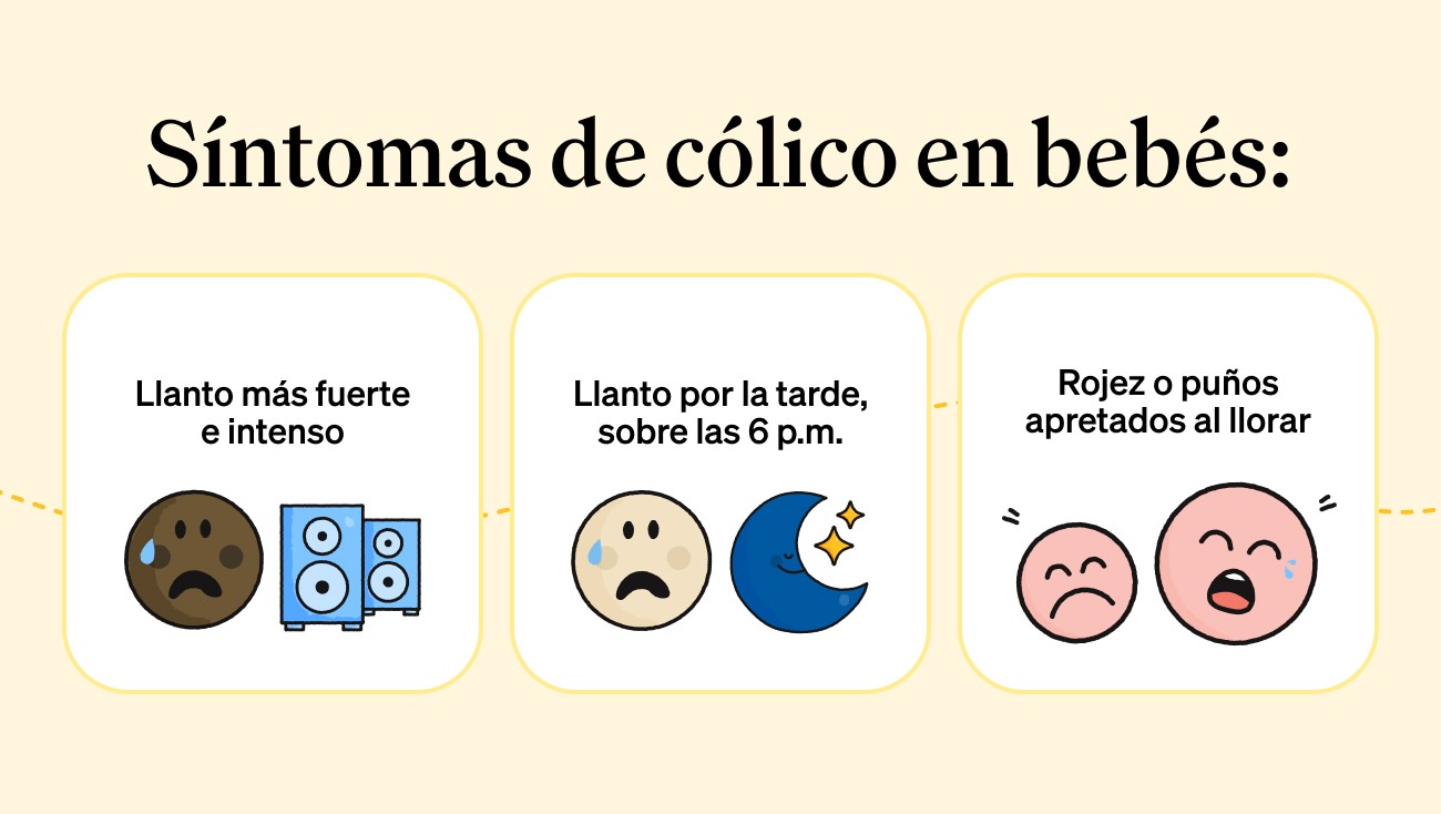 Si tu recién nacido desarrolla cólicos, normalmente comenzarás a notar los síntomas entre las 3 y 6 semanas de edad. La buena noticia es que el cólico a menudo comienza a disminuir cuando tu bebé tiene entre 3 y 4 meses de edad.
